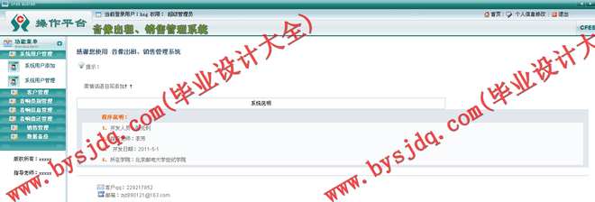 随着计算机技术的高速发展,人们对计算机的依赖性越来越强,特别是用计算机开发的数据库以及数据管理系统在生活应用中表现得更为突出,为此开发此租赁,出售系统。通过使用音像租赁,出售管理系统,使音像租赁店的租赁管理工作系统化、规范化、自动化、简易化、智能化,系统包括系统用户管理,音像信息管理、音像类别管理、音像偿还管理,销售管理、客户管理,数据备份、其它设定等模块。实现了对音像制品的添加、查找、编辑、删除以及出租,出售的基本功能,对已出租音像制品的查询、结帐等功能,对、用户的添加、删除、查询等基本功能。从而达到提高音像管理效率的目的。