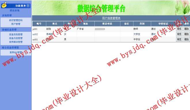 (1)用户管理:主要是管理注册系统的教师和学生信息,并对注册信息进行审核的操作,不符合要求的注册可以进行删除处理