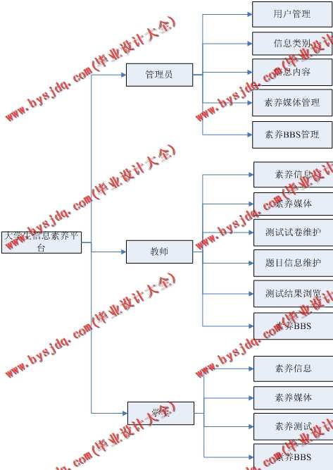 为了能做好本课题,在参阅了现有的信息素养网站的基础上,初步确定了本网站平台的基本架构,即:管理后台、前台信息素养平台功能,下面按照角色详细描述功能模块内容: