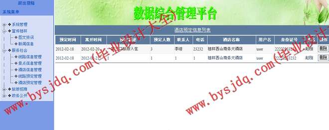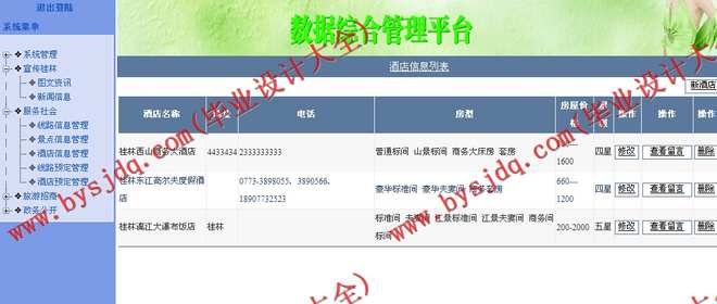 此项功能是此旅游网站的重中之重,游客或者会员通过它可以了解桂林各种各样的旅游资源,景点信息,酒店信息以及各种旅游线路安排等,同时游客注册以后,可以对酒店、景点、线路信息进行评价并可以预定酒店和线路信息。
