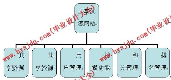 首先,本系统功能模块主要分为:共享资源的发布、共享资源的下载、用户管理、搜索功能、积分管理、排名管理。