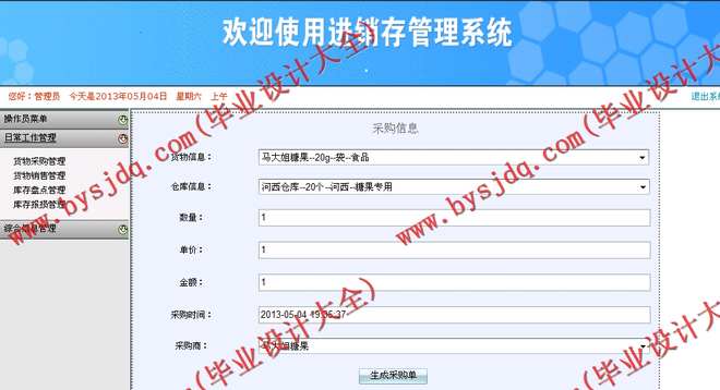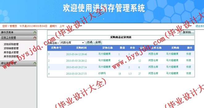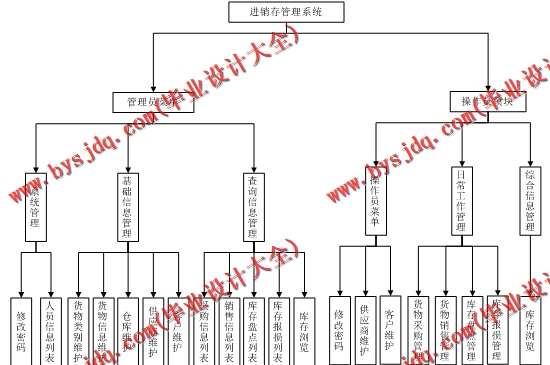本系统主要划分为两层用户角色功能模块,管理员、操作员;管理员主要是对于系统的基本信息维护和综合信息管理几个模块,主要功能包括:货物类别、货物信息、仓库管理、供应商、客户管理等;同时可以对各种业务进行查询操作,如采购信息查询、销售信息以及库存相关信息查询等;操作员主要是管理日常业务,包括供应商、客户的维护,同时可以处理日常的货物采购、货物销售、库存盘点以及库存报损等。