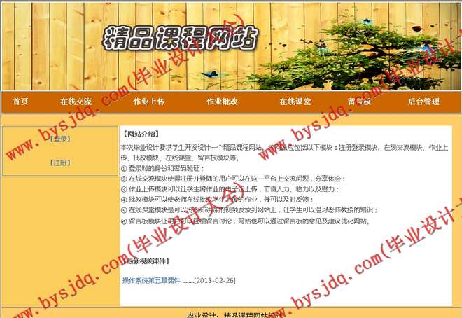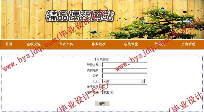 本次毕业设计要求学生开发设计一个精品课程网站。该网站应包括以下模块:注册登录模块、在线交流模块、作业上传、批改模块、在线课堂、留言板模块等。