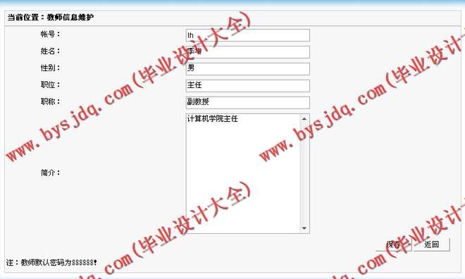☆ 修改密码:修改登录人员密码。☆ 时间段管理:管理考试时间段信息。☆ 教师信息管理:维护教师信息,可以增加、修改和删除教师信息 ☆ 班级信息管理:维护班级信息,可以增加、修改和删除班级信息。☆ 教室信息管理:维护安排考试的教室信息。☆ 考试安排审核:审核安排考试的信息,可以进行通过审核和冲突处理。☆ 历史考试安排信息:展示所有老师申请考试的历史综合列表。教师主要是进行考试安排信息的申请,以及作废申请等功能:☆ 修改密码:修改登录人员密码