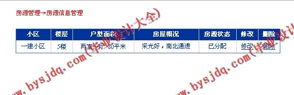 (1) 房源管理:主要功能是对房源信息(包括小区、楼房、户型等)进行分类、状态监控等管理,主要包括:房源信息采集、修改、删除、统计、浏览、打印等功能;