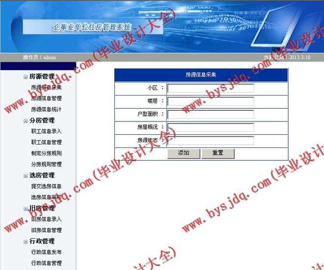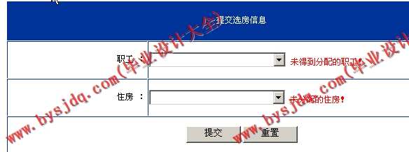 (3) 选房管理:主要功能是对部门职工信息、选房信息的管理;提交选房信息、选房信息审核与归类;