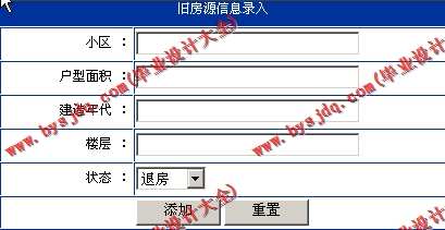 (4) 旧房管理:主要功能是对公司已住的房屋进行管理,包括退房和房屋再分配两部分。涉及到旧房数据的录入、维护、归类、浏览等操作;
