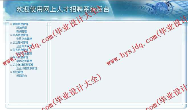 网上人才招聘系统主要由新闻管理,个人成员管理,企业会员管理,招聘管理求职管理四个部分组成。本课题主要功能详解如下: