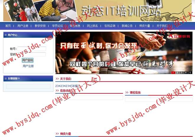 本系统主要研究了一个关于雅思学习的教学网站系统主要实现的功能包括:教学安排,在线学习论坛,课程推荐,免费注册,网上报名,用户登录,在线咨询,新闻公告,友情链接,名师访谈等功能模块。