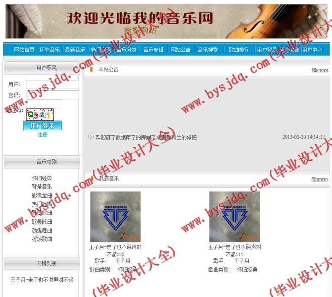 音乐网站是一个典型的音乐网站,网站分为前台和后台2个大的模块,每个模块都有自己的权限功能。网站前台显示了所有的音乐,专辑,播放列表,网站的公告等。网站提供了会员注册功能,注册了的会员可以登录网站,实现普通用户没有的功能,例如会员可以在论坛中进行交流,可以搜索添加好友,可以和好友进行音乐的交流。后台管理员对前台涉及到的所有信息进行管理。开发这样的一个网站实现了一般音乐网站的所有功能,本站的特色就在于前台分为2种角色可以具备不同的权限功能 。