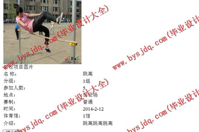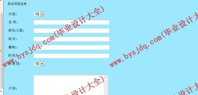 田径项目信息表(id,分组,名 称,参加人数,地点,赛制,时间,体育馆,介绍,项目图片)