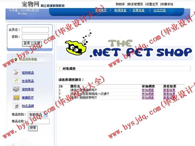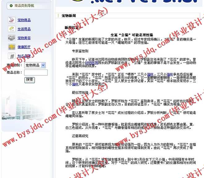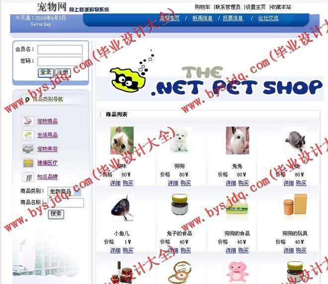 2. 购买商品: 宠物网网上购物所体现的主题-----宠物用品购买。该功能包括用户收藏自己所喜欢的商