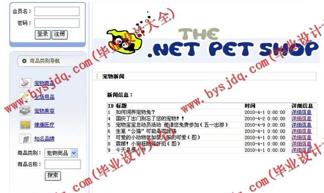 然后以线下寄款的形式付款。而且在商品用存在大众所欢迎的宠物比如猫,狗,兔子,鱼,乌龟等宠物的销售,同时也包括对于这些宠物的相关宠物用品的销售,例如宠物的食品,宠物的玩具,宠物的衣服,以及宠物的窝,鱼缸,乌龟缸等宠物容器的销售。让全部用户对本商店的商品进行分类浏览,按所需条件查找商品。方便用户了解本店商