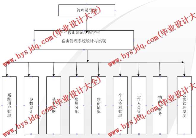 (1)参数设计(主要是对房源类型、学生类别、部门、院系、收费标准、卫生评比指标以及操作人员的权限等进行设置);