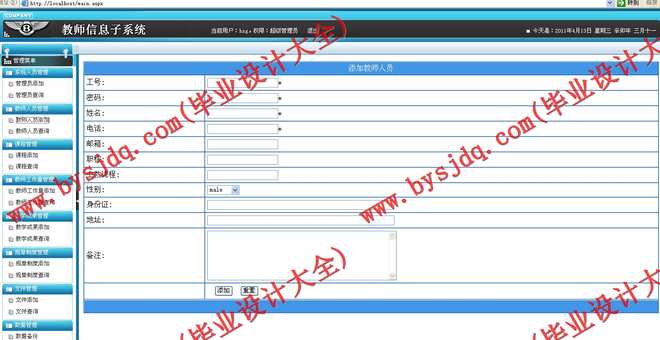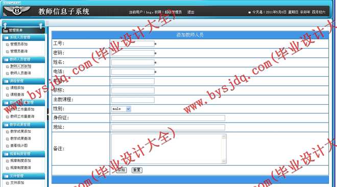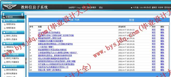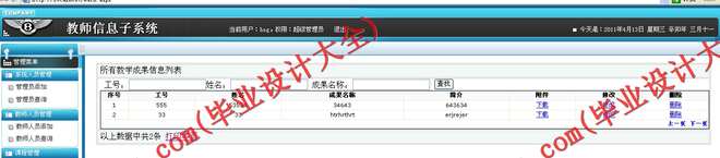 对教师的个人资料、文件管理、教学成国、教研成果、异动情况、考勤情况、培训情况等进行新增、修改、删除、查看操作。其中教师个人资料包含教师照片。对教师的信息管理按部门进行。