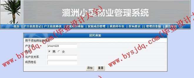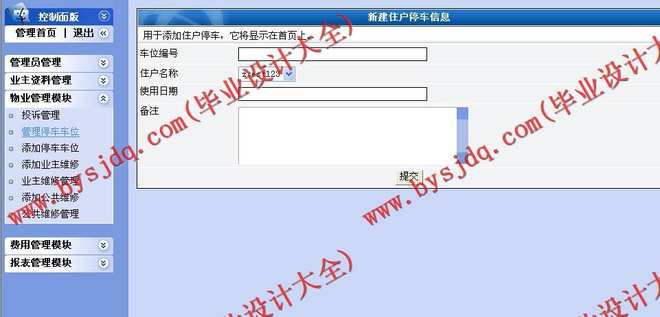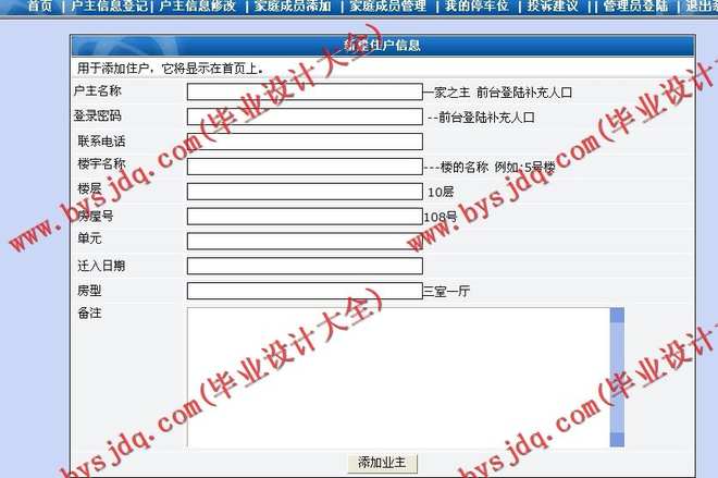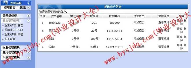 1、住户管理:对所有入住小区的住户进行详细的登记。包括住户编号,住户姓名,联系电话,住房地址,房屋编号,住房面积的登记,有车的包括车位编号的分配与登记。系统管理员可以在需要核对信息时对住户信息进行查询,还可以对住户信息进行增加,删除和修改操作。