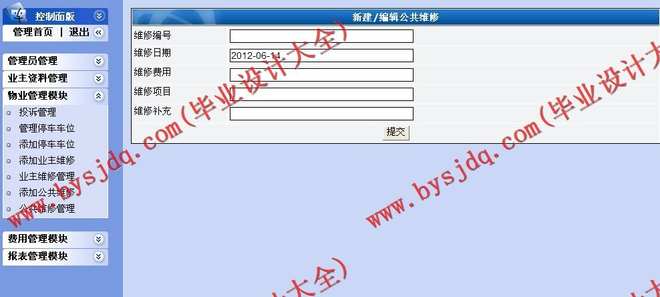 3、维修登记:对要求进行维修的住户信息进行详细的登记。包括维修编号,维修名称,维修日期,维修人员,维修费用的登记。