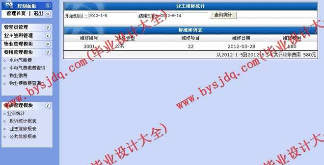 5、维修查询:主要是查询某日共有什么项目要维修或者查询某维修员共维修了一些什么项目,或者查询某住户都进行了一些什么维修。