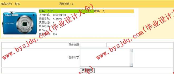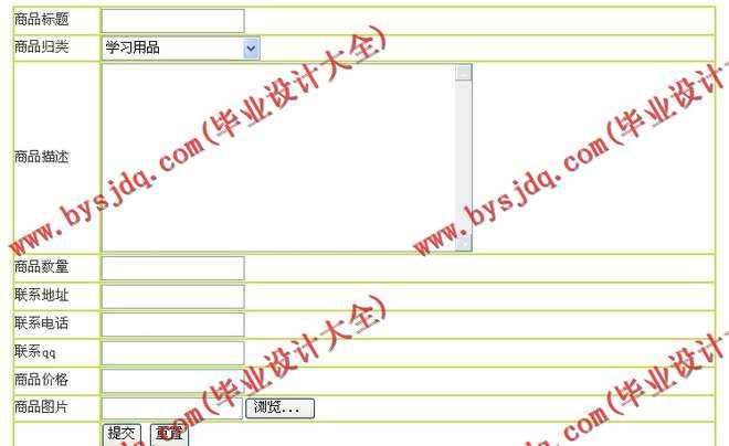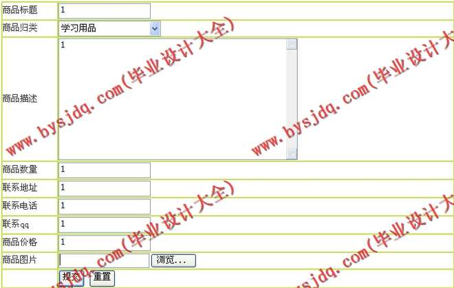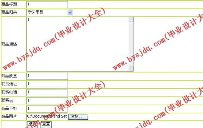会员登录之后可进行商品发布操作,发布一个商品需要填写的信息有商品标题、商品归类、商品描述、商品数量、联系地址、联系电话、联系QQ、商品价格、商品图片。发布商品时,当其中任意一项填写为空时,系统将有相应的“不能为空”提示。其中商品的图片可通过“浏览”窗口进行上传,当这一项为空时系统将提示“上载失败!
