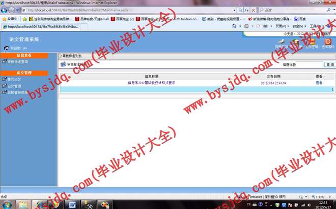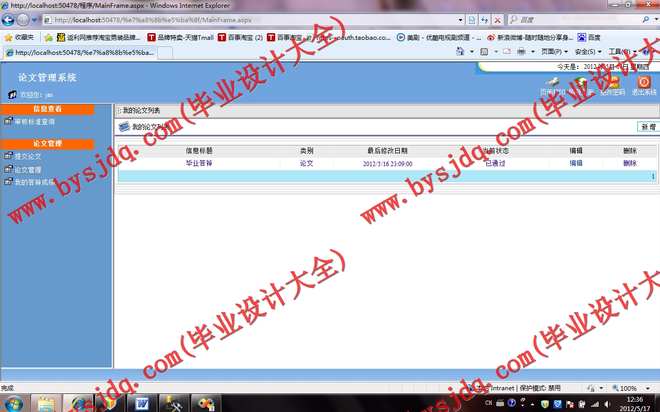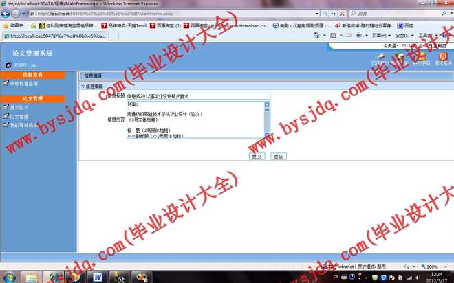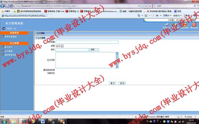 随着计算机技术及网络技术的发展,中国已全面进入网络信息化时代。在信息时代来临之季,学校各部门的工作都紧跟时代的脚步,转变着工作及管理模式,从传统的人工管理体制,向信息自动化管理体制过渡。与此同时,学校的传统论文管理模式也在逐步向自动化办公管理模式转变。毕业学生为了获得学位必须提交论文,以此作为论文的标准。因此,需要学校的相关管理员对论文进行评审,评审通过后可以为学生颁发学位证书。在传统的方式下,论文审核工作非常复杂和繁索,需要学院及学校等相关部门和人事的层层审批,学院需要对论文进行评审,学院最后再提交到到学校进行审批,审核期间审核资料的传递比较麻烦,容易出错或丢失,有问题与学生沟通也不及时不方便。严重影响了论文管理的质量和效率。论文管理系统就是在这样的背景下应运而生的。