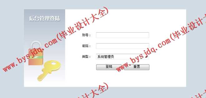 1.描述:为了保证系统的安全性,要使用本系统必须先登陆到系统中。管理员登录采用AJAX方式进行验证,先是在前台获取输入的管理中登录账号、密码,点击登录后,通过AJAX方式,后台异步进行验证,实现页面无刷新的管理员登录。