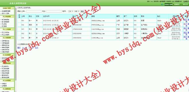 通过登录界面登录后,有两种方式使用该系统,一种为快捷操作方式,将操作功能以列表的形式置于左侧,一种是通过部门列表,通过点击进入各个部门,从而对部门员工的信息进行增删改查等操作,点击进入各部门后这些操作的功能与快捷操作方式相同。