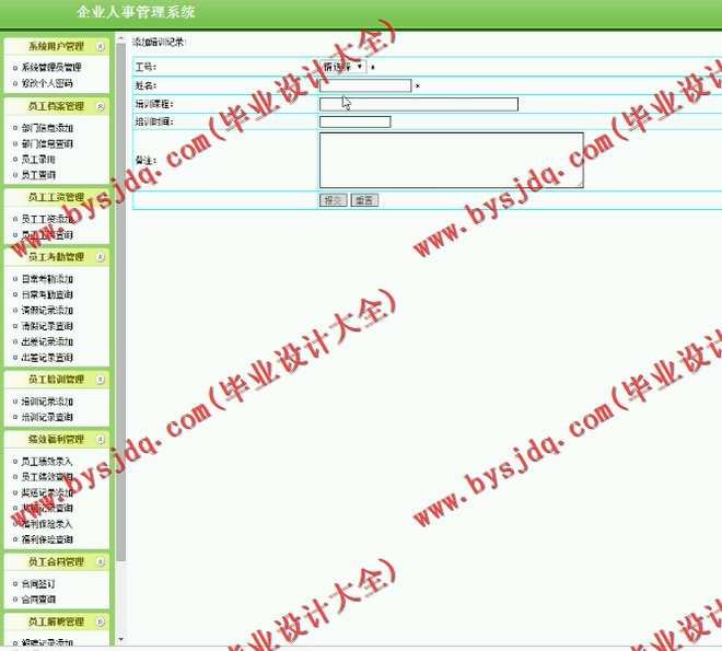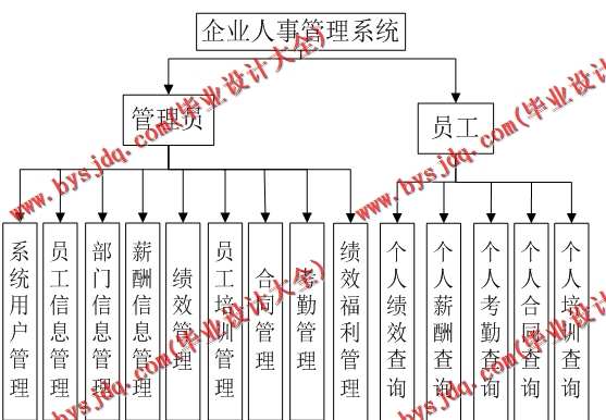 企业人事管理是企业管理的一个重要内容,随着时代的进步,企业也逐渐变得庞大起来。各部门和人员较多,信息流转量大,工作繁重。为提高公司员工的办公效率,减轻工作人员工作负担,节约办公经费,从而实现企业远程及办公无纸化、资源信息化、决策科学化、知识共享化,进而实现对客户档案进行分区管理,部门级信息、财务信息记录以及报表的网上查询,所以很有必要建立一个高质量、高效率、智能化的办公系统,协助企业实现办公自动化、网络化、电子化,为企业搭建一个通用化与个性化兼顾的企业办公解决平台。该系统是一个基于jsp的企业人事管理系统,主要由系统用户管理、员工档案管理、员工工资管理、员工考勤管理、员工培训管理、绩效福利管理、员工合同管理、员工解聘管理、系统管理等几大模块组成。具体如下: