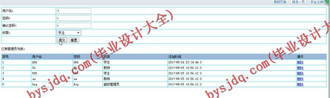 1)登录模块:只有提供正确的用户名和登录口令以及身份之后,才能进入毕业设计管理系统进行进操作。同时,根据登录名,判断用户所拥有的权限,决定用户进入系统后所能做的操作。