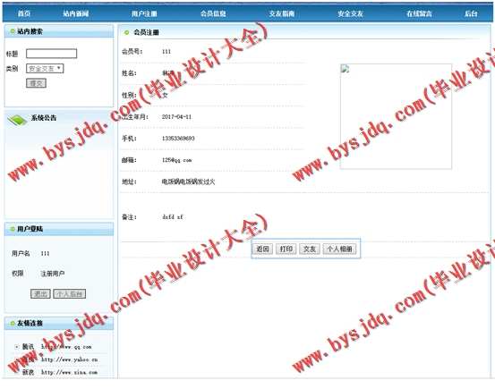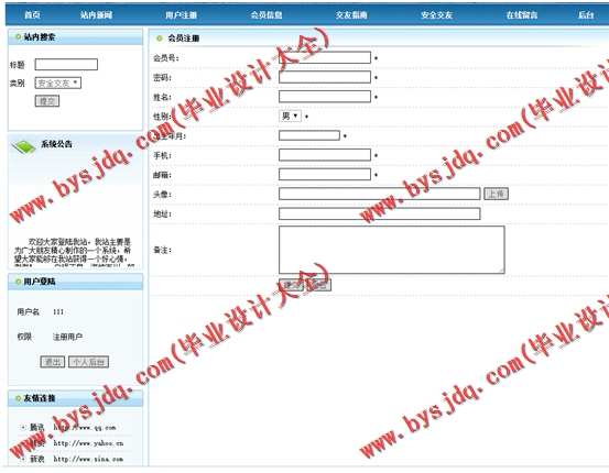 系统管理:数据备份、友情链接添加、友情链接查询、系统简介设置、留言管理、系统公告设置。