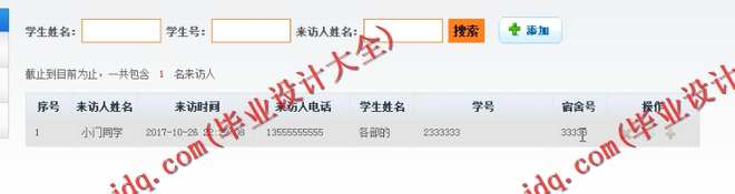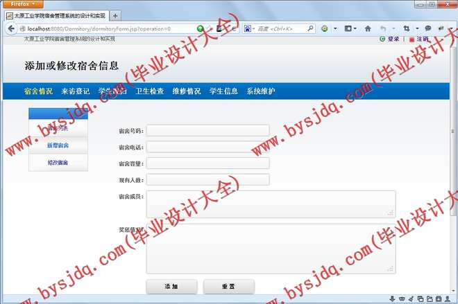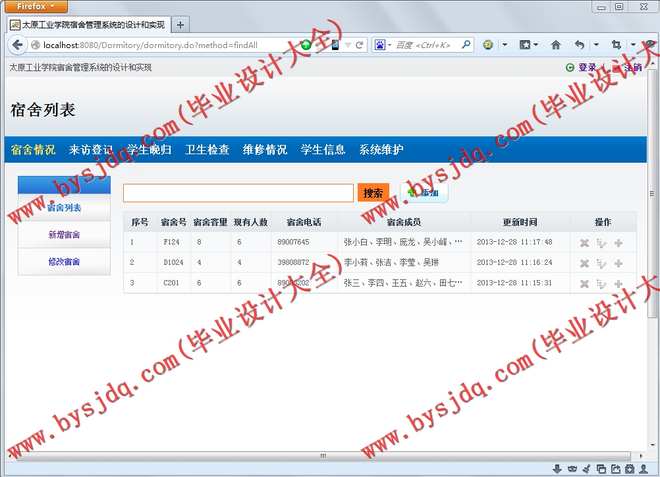 如果登录用户是普通员工,那么操作界面就只有浏览功能;如果登录用户是管理员,那么这里的前台又具备了后台的功能。在这里可以时时看到宿舍信息的变化,除了可以查阅宿舍信息功能外,还支持添加、删除、修改宿舍的功能。