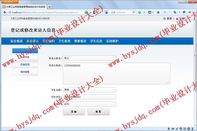 本系统主要就太原工业学院宿舍管理设计,主要完成学生信息管理、宿舍信息管理、卫生检查管理、来访登记、保修系统、用户管理等功能。具备一般的宿舍管理要求,方便信息存储管理,方便信息查阅和维护。