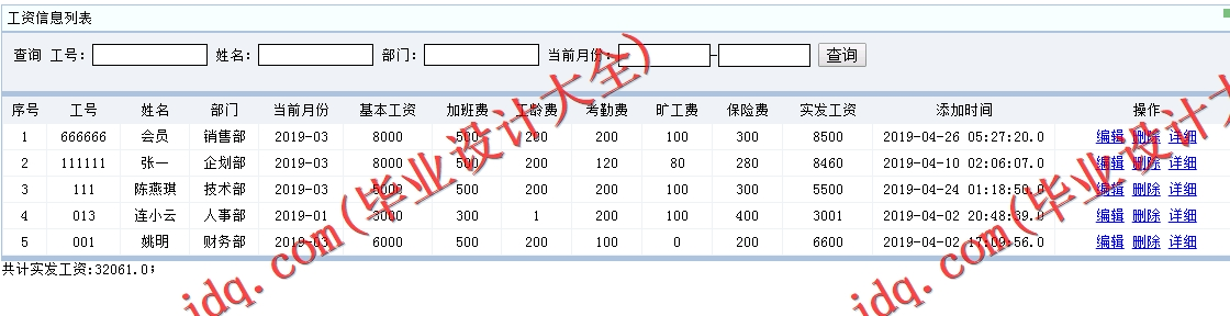 薪资信息列表:显示系统的所有薪资信息,可以通过关键字查询。