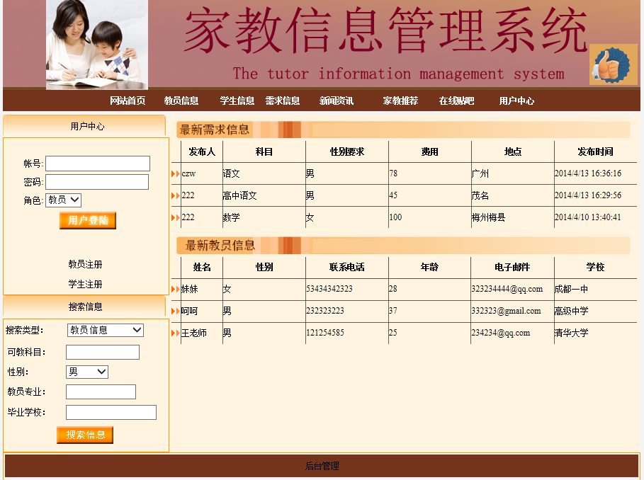 家教管理系统首页是网站的第一个页面包括了重要的信息 ,顶部是网站的功能连接,包括教员信息,需求信息,网站公告,在线咨询,在线交流,用户中心,后台管理入口等连接,点击相应的菜单就会进入相应的功能页面。